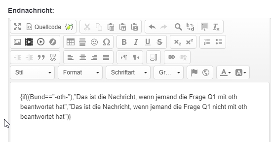 Naja, dann sieht er auch keine Endnachricht.Ich habe in die Letzte Fragengruppe zwei Texte eingebettet und diese dann mit Bedingungen hinterlegt - leider kann aber an dieser Stelle die Umfrage noch verlassen und die Antworten gelöscht werden - ich habe keine Administratorenrechte wodurch ich die Schaltfläche auch nicht im Editor verbergen kann.