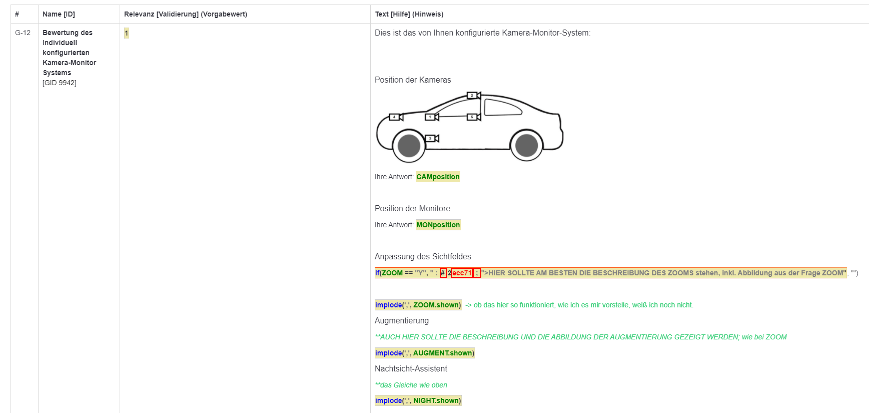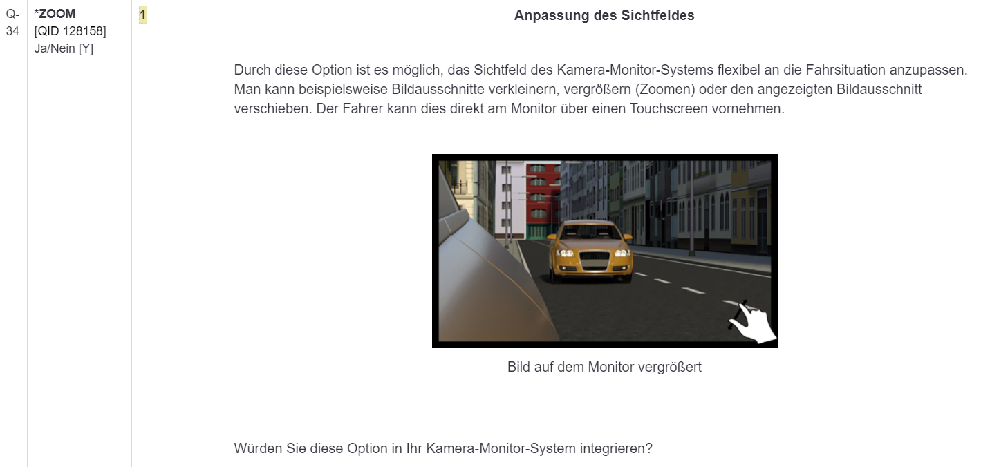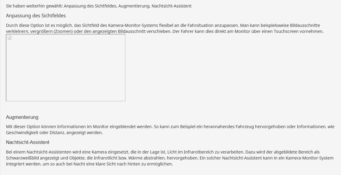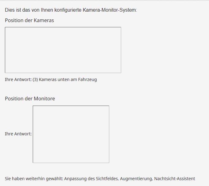 <p style="margin:0cm 0cm 8pt"><span style="font-size:12pt"><span style="line-height:normal"><span style="font-family:Arial,sans-serif">Dies ist das von Ihnen konfigurierte Kamera-Monitor-System:</span></span></span></p> <p style="margin:0cm 0cm 8pt"><span style="font-size:12.0pt"><span style="line-height:107%"><span arial="" style="font-family:">Position der Kameras</span></span></span></p> <p style="margin:0cm 0cm 8pt"><span style="font-size:12.0pt"><span style="line-height:107%"><span arial="" style="font-family:"><img alt="" src="/survey/upload/surveys/544794/images/Zeichnung_Auto_final.jpg" style="height: 150px; width: 380px;" /></span></span></span></p> <p style="margin:0cm 0cm 8pt">Ihre Antwort: <span style="white-space: pre-wrap;">{CAMposition.shown}</span></p> <p style="margin:0cm 0cm 8pt"> </p> <p style="margin:0cm 0cm 8pt"><span style="font-size:12.0pt"><span style="line-height:107%"><span arial="" style="font-family:">Position der Monitore</span></span></span></p> <p style="margin:0cm 0cm 8pt">Ihre Antwort: <span style="white-space: pre-wrap;">{MONposition.shown}</span></p> <p style="margin:0cm 0cm 8pt"> </p> <p style="margin:0cm 0cm 8pt">Sie haben weiterhin gewählt: {list(if(ZOOM=="Y",'Anpassung des Sichtfeldes',''),if(AUGMENT=="Y",'Augmentierung',''),if(NIGHT=="Y",'Nachtsicht-Assistent',''))}</p> <p style="margin:0cm 0cm 8pt"><span style="font-size:12.0pt"><span style="line-height:107%"><span arial="" style="font-family:">{if(ZOOM=="Y","Anpassung des Sichtfeldes","")}</span></span></span></p> <p style="margin:0cm 0cm 8pt">{if(ZOOM=="Y","Durch diese Option ist es möglich, das Sichtfeld des Kamera-Monitor-Systems flexibel an die Fahrsituation anzupassen. Man kann beispielsweise Bildausschnitte verkleinern, vergrößern (Zoomen) oder den angezeigten Bildausschnitt verschieben. Der Fahrer kann dies direkt am Monitor über einen Touchscreen vornehmen.<img src="/survey/upload/surveys/544794/images/Zoom2.jpg" style="width: 400px; height: 225px;" />","")}</p> <p style="margin:0cm 0cm 8pt"> </p> <p style="margin:0cm 0cm 8pt"><span style="font-size:12pt"><span style="line-height:107%"><span style="font-family:Arial,sans-serif">{if(AUGMENT=="Y","Augmentierung","")}</span></span></span></p> <p style="margin:0cm 0cm 8pt">{if(AUGMENT=='Y','Mit dieser Option können Informationen im Monitor eingeblendet werden. So kann zum Beispiel ein herannahendes Fahrzeug hervorgehoben oder Informationen, wie Geschwindigkeit oder Distanz, angezeigt werden.','')}</p> <p style="margin:0cm 0cm 8pt"><font face="Arial, sans-serif"><span style="font-size: 16px;">{if(NIGHT=='Y','Nachtsicht-Assistent','')}</span></font></p> <p style="margin:0cm 0cm 8pt">{if(NIGHT=='Y','Bei einem Nachtsicht-Assistenten wird eine Kamera eingesetzt, die in der Lage ist, Licht im Infrarotbereich zu verarbeiten. Dazu wird der abgebildete Bereich als Schwarzweißbild angezeigt und Objekte, die Infrarotlicht bzw. Wärme abstrahlen, hervorgehoben. Ein solcher Nachtsicht-Assistent kann in ein Kamera-Monitor-System integriert werden, um so auch bei Nacht eine klare Sicht nach hinten zu ermöglichen.','')}</p>