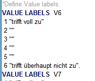 3. VALUE LABELS (hier werden die Antwortmöglichkeiten zugeordnet)
