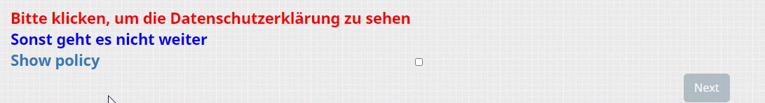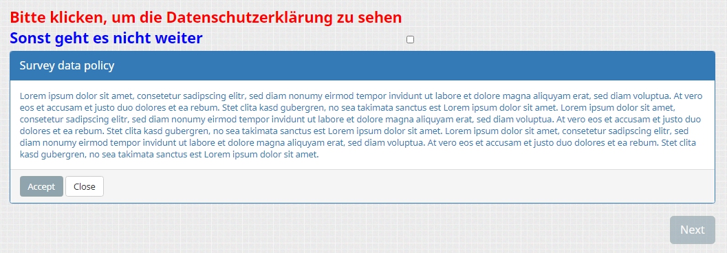 und ich habe noch einmal eine sehr spezielle Frage. Um an meiner Umfrage teilnehmen zu könne, müssen die Teilnehmer erst in die Datenschutzrichtlinien einwilligen.