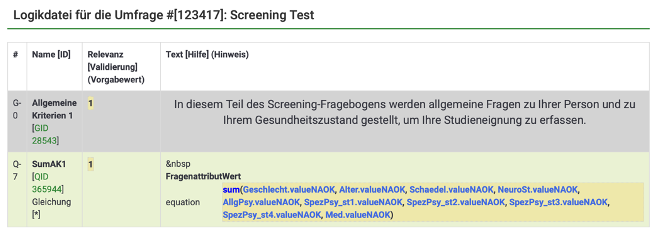 Das könnte also bedeuten, dass sie sich bis zur vorletzten Gruppe durch den Fragebogen gequält haben, um dann zu erfahren, dass sie rausfliegen.Dazu soll nach jeder Fragegruppe jeweils eine Summe/ein Scoring der Antworten der Fragegruppe stattfinden. Auf der Grundlage der Summe/des Scorings sollen die Teilnehmerinnen entweder zur nächsten Fragegruppe gelangen oder eine Benachrichtigung bekommen, dass sie nicht geeignet zur Teilnahme an der Studie sind.