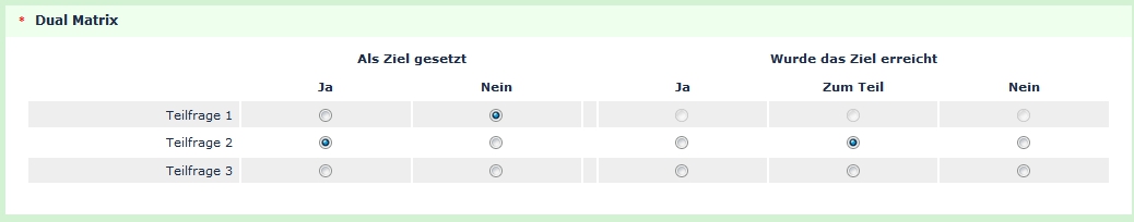 <script type="text/javascript" charset="utf-8"> $(document).ready(function() { // Identify this question var thisQuestion = $('#question{QID}'); // Identify the "exclusive" column(s) // Multiple columns separated by commas var exclusiveCols = [2]; // Assign classes to various elements $('.answers-list', thisQuestion).each(function(i){ var column = 1; var scale = 1; $('td', this).each(function(i){ if($(this).hasClass('radio-item')) { $(this).addClass('scale-'+scale+' column-'+column+''); column++; } else { column = 1; scale = 2; } }); $('td:last', this).addClass('na-item'); }); $(exclusiveCols).each(function(i) { $('td.scale-1.column-'+this, thisQuestion).addClass('exclusive-item'); }); // Hide the "N/A" column $('td.na-item', thisQuestion).hide(); $('.questions-list .dsheader:last', thisQuestion).attr('colspan', Number($('.questions-list thead tr.groups .dsheader:last', thisQuestion).attr('colspan'))-1); $('.questions-list thead tr:not(.groups) th:last', thisQuestion).hide(); var colsWidth = $('col.odd:eq(0)', thisQuestion).attr('width').replace(/%/, '')*$('col.odd, col.even', thisQuestion).length; var newColWidth = colsWidth/($('col.odd, col.even', thisQuestion).length-1); $('col.odd, col.even', thisQuestion).attr('width', newColWidth+'%'); // Listener on the radios $('td.scale-1 input.radio', thisQuestion).click(function(e) { var thisCell = $(this).closest('td'); var thisRow = thisCell.closest('tr'); if(thisCell.hasClass('exclusive-item')) { $('.na-item input.radio', thisRow).trigger('click'); $('td.scale-2:not(.na-item) input.radio', thisRow).prop('disabled', true); } else { $('.na-item input.radio', thisRow).prop('checked', false); $('td.scale-2:not(.na-item) input.radio', thisRow).prop('disabled', false); } }); // Initial states $('td.exclusive-item input.radio:checked', thisQuestion).each(function(i) { var thisRow = $(this).closest('tr'); $('.na-item input.radio', thisRow).trigger('click'); $('td.scale-2:not(.na-item) input.radio', thisRow).prop('disabled', true); }); }); </script>