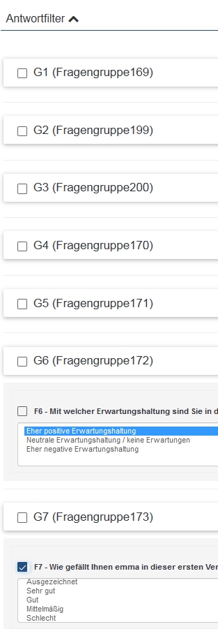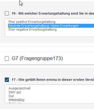 Du siehst, dass hier die Frage F7 angecheckt ist (diese wird also angezeigt) und in Frage F6 ist eine Antwortmöglichkeit ausgewählt (nach dieser wird gefiltert).