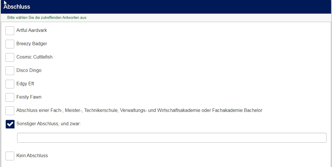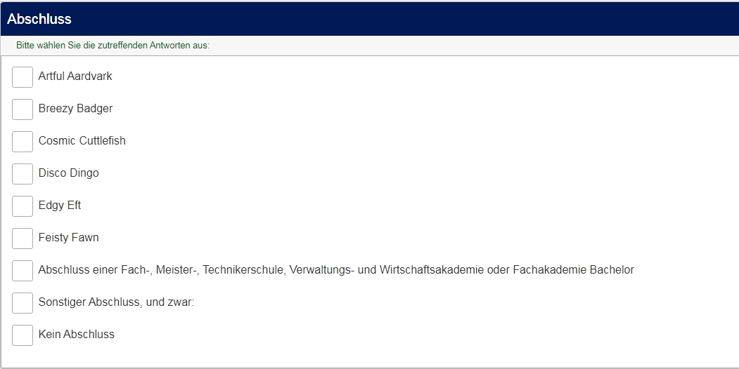 Da LimeSurvey ein bisschen schwachbrüstig ist, was die visuelle Gruppierung angeht, empfehlen wir, jeweils eine Gruppe pro Frage anzulegen, und dann "Gruppe für Gruppe" anzuzeigen.