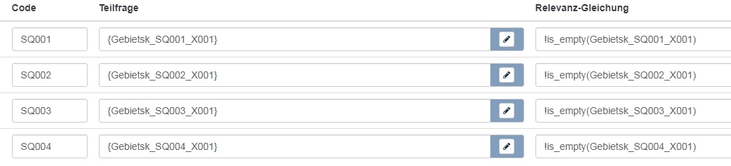 Außerdem musst Du in dieser Frage natürlich Teilfragen-Relevanz einbauen, damit nur die Zeilen angezeigt werden, die in "Gebietsk" auch gefüllt waren.