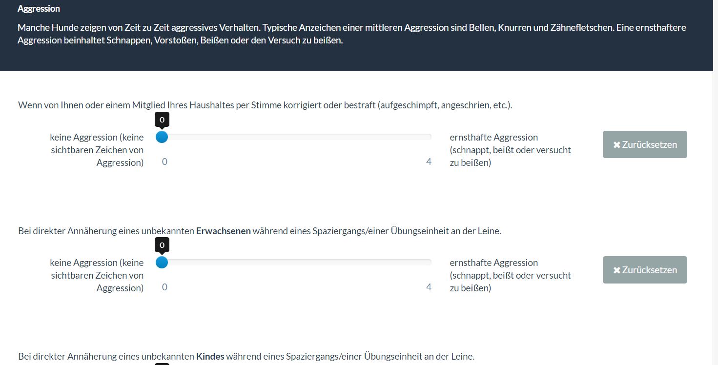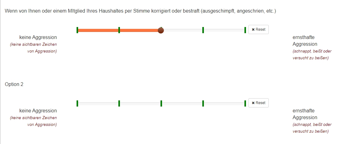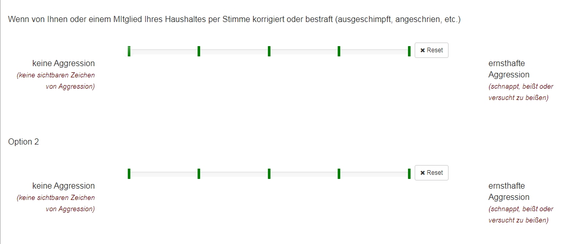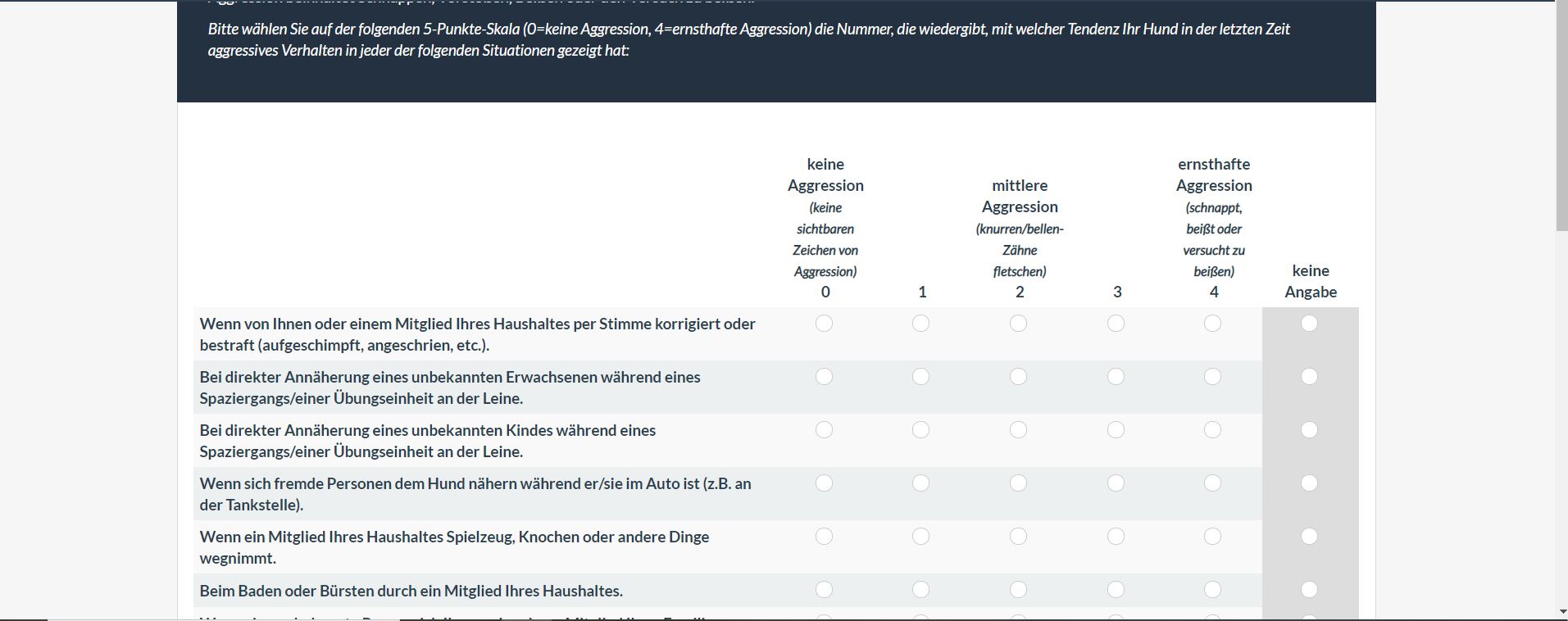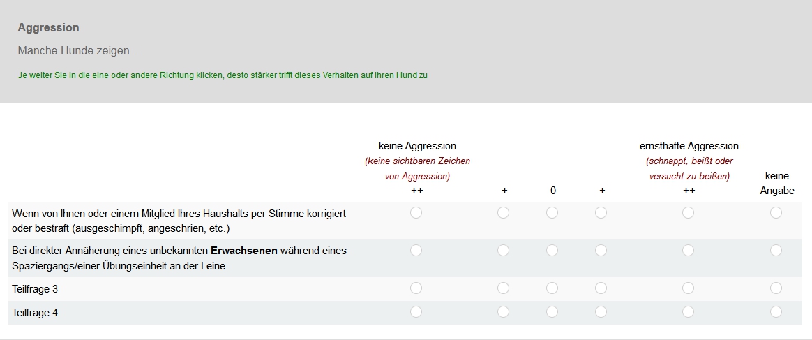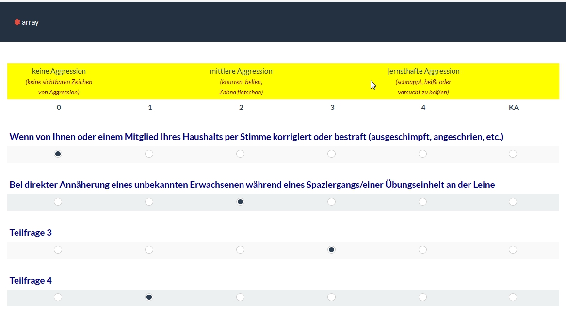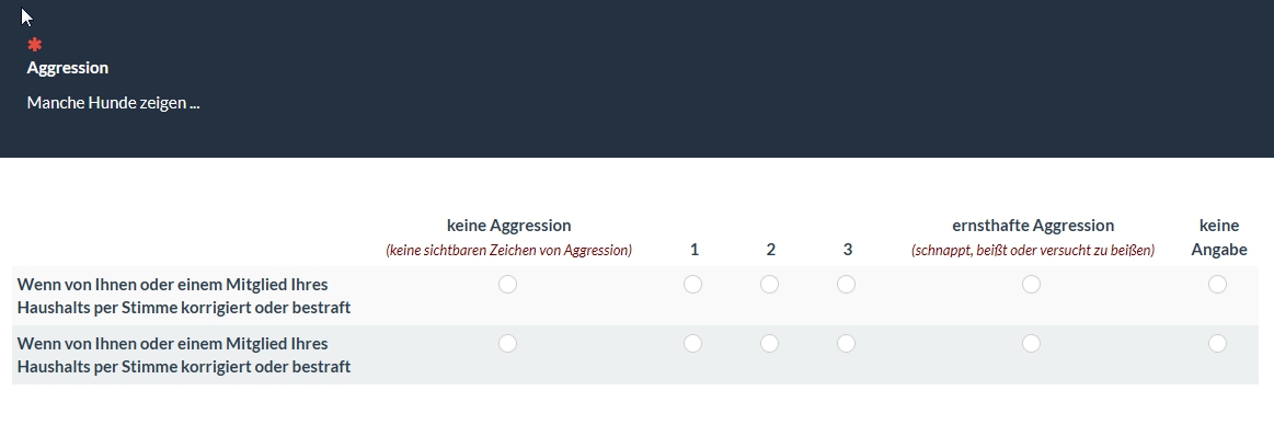 <script type="text/javascript" charset="utf-8"> $(document).ready(function() { // Identify this question var thisQuestion = $('#question{QID}'); // Define the sub-heading text strings var subHeading1 = '<span style="font-size:14pt;color:navy"><br>Wenn von Ihnen oder einem Mitglied Ihres Haushalts per Stimme korrigiert oder bestraft (ausgeschimpft, angeschrien, etc.)</span>'; var subHeading2 = '<span style="font-size:14pt;color:navy"><br>Bei direkter Annäherung eines unbekannten <b>Erwachsenen</b> während eines Spaziergangs/einer Übungseinheit an der Leine</span>'; var subHeading3 = '<span style="font-size:14pt;color:navy"><br>Teilfrage 3</span>'; var subHeading4 = '<span style="font-size:14pt;color:navy"><br>Teilfrage 4</span>'; var columnsLength = $('tr.answers-list:eq(0) > *', thisQuestion).length; // Insert the new rows $('tr.answers-list:eq(0)', thisQuestion).before('<tr class="sub-header-row"><th colspan="'+columnsLength+'">'+subHeading1+'</th></tr>'); $('tr.answers-list:eq(1)', thisQuestion).before('<tr class="sub-header-row"><th colspan="'+columnsLength+'">'+subHeading2+'</th></tr>'); $('tr.answers-list:eq(2)', thisQuestion).before('<tr class="sub-header-row"><th colspan="'+columnsLength+'">'+subHeading3+'</th></tr>'); $('tr.answers-list:eq(3)', thisQuestion).before('<tr class="sub-header-row"><th colspan="'+columnsLength+'">'+subHeading4+'</th></tr>'); // Fix up the row classes var rowClass = 1; $('table.subquestions-list tbody tr', thisQuestion).each(function(i) { if($(this).hasClass('sub-header-row')) { rowClass = 1 } else { rowClass++; $(this).removeClass('array1 array2') if(rowClass % 2 == 0) { $(this).addClass('array2'); } else { $(this).addClass('array1'); } } }); }); </script> <script type="text/javascript" charset="utf-8"> $(document).on('ready pjax:scriptcomplete',function(){ // Insert the column categories $('#question{QID} table.subquestion-list thead tr:eq(0) td:eq(0)').remove(); $('#question{QID} table.subquestion-list thead').prepend('<tr class="ls-heading">\ <td rowspan="1" colspan="1" style="border-bottom:0 !important;background-color:yellow;text-align:center"></td>\ <td rowspan="1" colspan="1" style="border-bottom:0 !important;background-color:yellow;text-align:center">keine Aggression<br><span style="font-weight:normal;color:maroon;font-style:italic;font-size:10pt">(keine sichtbaren Zeichen<br>von Aggression)</span></td>\ <td colspan="3" style="border-bottom:0 !important;background-color:yellow;text-align:center">mittlere Aggression<br><span style="font-weight:normal;color:maroon;font-style:italic;font-size:10pt">(knurren, bellen,<br>Zähne fletschen)</span></td>\ <td rowspan="1" colspan="1" style="border-bottom:0 !important;background-color:yellow;text-align:center">|ernsthafte Aggression<br><span style="font-weight:normal;color:maroon;font-style:italic;font-size:10pt">(schnappt, beißt oder<br>versucht zu beißen)</span></td>\ <td rowspan="1" colspan="1" style="border-bottom:0 !important;background-color:yellow;text-align:center"></td>\ </tr>'); }); </script>