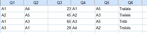Ich habe leider bei den Antwortoptionen A1, A2 etc. verwendet. Damit kann ich in SPSS nicht rechnen.