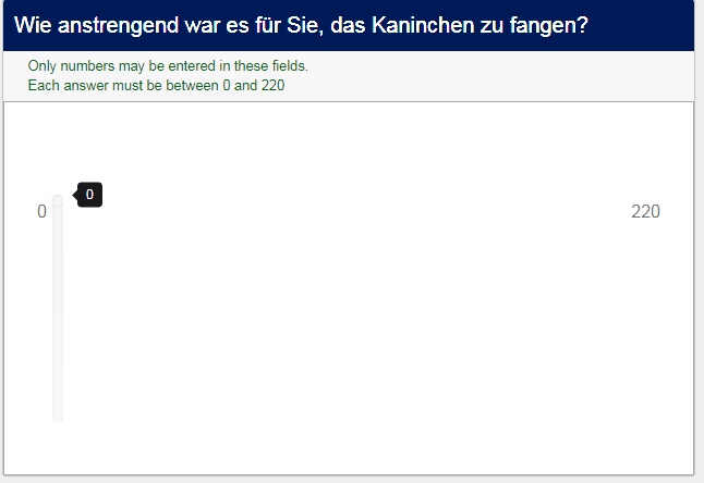 <script type="text/javascript" charset="utf-8"> $(document).on('ready pjax:scriptcomplete',function(){ var ticksArray = [ [20, 'Kaum'], [40, 'Etwas'], [60, '60'], [75, 'Einiger-<br>maßen'], [100, '100'], [118, 'Ziemlich'], [140, '140'], [155, 'Stark'], [186, 'Sehr<br>stark'], [205, 'Außer-<br>ordentlich'], ]; insertSliderTicks('{QID}', ticksArray); }); /* Insert Slider Tick Marks */ function insertSliderTicks(qID, ticksArray) { var thisQuestion = $('#question'+qID); $(thisQuestion).addClass('with-inserted-ticks'); $('input:text', thisQuestion).on('slideEnabled',function(){ var thisSlider = $(this); var thisItem = $(thisSlider).closest('li'); var thisMin = $('.slider-handle:eq(0)', thisItem).attr('aria-valuemin'); var thisMax = $('.slider-handle:eq(0)', thisItem).attr('aria-valuemax'); var thisRange = thisMax - thisMin; $.each(ticksArray, function(i, val) { var tickRelativePosition = val[0] - thisMin; var tickPercent = (tickRelativePosition/thisRange)*100; // Insert tick marks $('.slider-handle:eq(0)', thisItem).before('<div class="inserted-tick left-'+tickPercent+'" style="left: '+tickPercent+'%">\ <div class="tick-text">'+val[1]+'</div>\ </div>'); }); }); } </script>