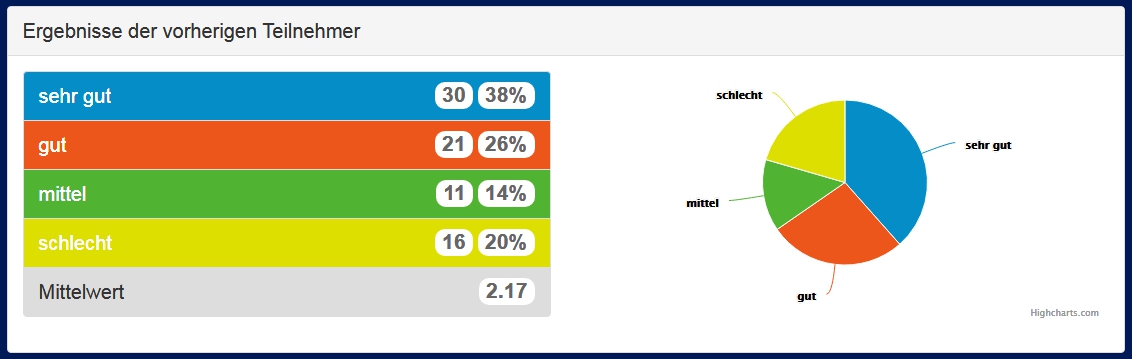 <div class="row"> <div class="col-sm-12"> <div class="panel panel-default"> <div class="panel-heading">Ergebnisse der vorherigen Teilnehmer</div> <div class="panel-body"> <div class="row"> <div class="col-sm-6"> <ul class="list-group"> <li class="list-group-item" style="background-color:#058DC7;color:white"> <span class="badge myBadge">{' [Q1.pc.1]'}%</span> <span class="badge myBadge">{' [Q1.nb.1]'}</span> sehr gut </li> <li class="list-group-item" style="background-color:#ED561B;color:white"> <span class="badge myBadge">{' [Q1.pc.2]'}%</span> <span class="badge myBadge">{' [Q1.nb.2]'}</span> gut </li> <li class="list-group-item" style="background-color:#50B432;color:white"> <span class="badge myBadge">{' [Q1.pc.3]'}%</span> <span class="badge myBadge">{' [Q1.nb.3]'}</span> mittel </li> <li class="list-group-item" style="background-color:#DDDF00;color:white"> <span class="badge myBadge">{' [Q1.pc.4]'}%</span> <span class="badge myBadge">{' [Q1.nb.4]'}</span> schlecht </li> <li class="list-group-item" style="background-color:#ddd;color:#333"> <span class="badge myBadge">{' [Q1.moy2]'}</span> Mittelwert </li> </ul> </div> <div class="col-sm-6"> <div id="chart1" style="width:100%;height:250px;"> </div> </div> </div> </div> </div> </div> </div> <script src="https://code.highcharts.com/highcharts.js"></script> <script type="text/javascript" charset="utf-8"> Highcharts.setOptions({ colors: ['#058DC7', '#ED561B', '#50B432', '#DDDF00', '#24CBE5', '#64E572', '#FF9655', '#FFF263', '#6AF9C4'], }); // Create the chart Drilldown Highcharts.chart('chart1', { chart: { type: 'pie', backgroundColor: 'transparent' }, title: { text: '' }, series: [{ name: '', data: [{ name: 'sehr gut', y: {' [Q1.nb.1]'} }, { name: 'gut', y: {'[Q1.nb.2]'} }, { name: 'mittel', y: {'[Q1.nb.3]'} }, { name: 'schlecht', y: {'[Q1.nb.4]'} }] }] }); </script>
