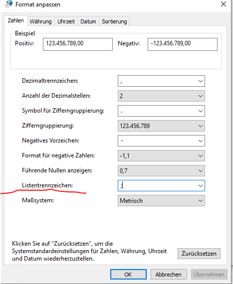 , Trennzeichen „Tabstopp“Datenformat der Spalten „Standard“
