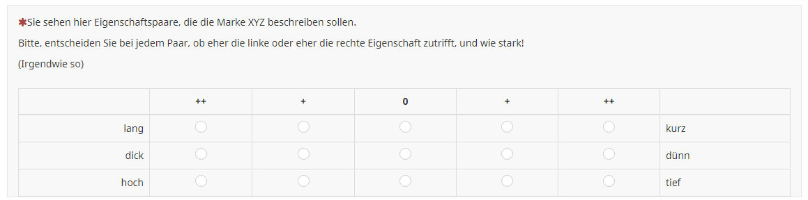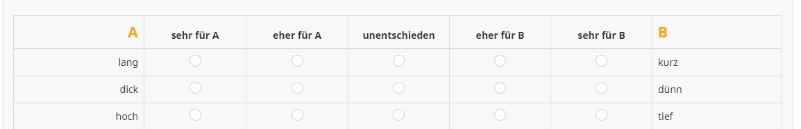 <script type="text/javascript" charset="utf-8"> $(document).on('ready pjax:scriptcomplete',function(){ // Insert the column categories $('#question{QID} table.subquestion-list thead').prepend('<tr class="ls-heading">\ <td colspan="1" style="text-align:right;color:orange;font-size:16pt;font-weight:bold">A</td>\ <th colspan="1" style="text-align:center;">sehr für A</th>\ <th colspan="1" style="text-align:center;">eher für A</th>\ <th colspan="1" style="text-align:center;">unentschieden</th>\ <th colspan="1" style="text-align:center;">eher für B</th>\ <th colspan="1" style="text-align:center;">sehr für B</th>\ <th colspan="1" style="text-align:left;color:orange;font-size:16pt;font-weight:bold">B</th>\ </tr>'); $('#question{QID} table.subquestion-list thead tr:eq(1) ').remove(); }); </script>