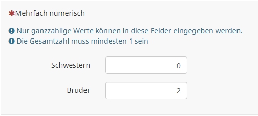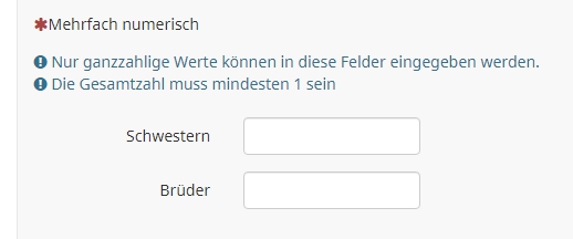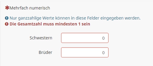 Dabei sollte die Frage auch eine Pflichtfrage sein, also explizite Eingabe von "0". Dies, damit man ein leeres Feld erlauben kann; sonst würde gleich am Anfang bei zwei leeren Feldern die Fehlermeldung leuchten.