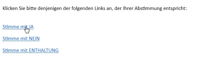 <a href="https://www.myServer.de/limesurvey/index.php/{SID}?token={TOKEN}&amp;Q1=Enthaltung&amp;newtest=Y">Stimme mit ENTHALTUNG</a>