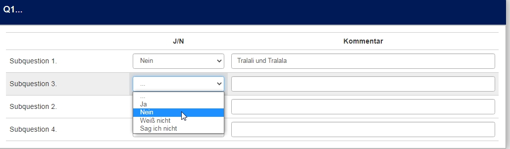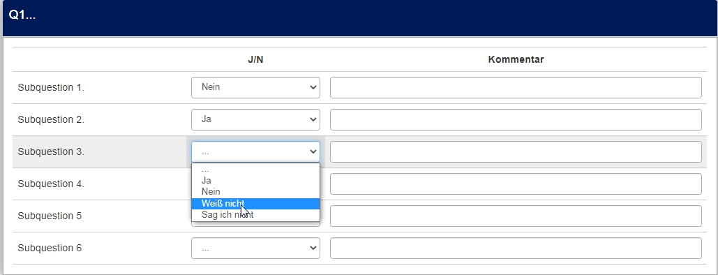 <script type="text/javascript" charset="utf-8"> $(document).on('ready pjax:scriptcomplete',function(){ var thisQuestion = $('#question{QID}'); // Add a question class thisQuestion.addClass('custom-array'); // Column-specific classes $('table.subquestion-list tr', thisQuestion).each(function(i) { $('th, td', this).each(function(i) { $(this).addClass('column-'+i); }); }); // Insert selects $('.answer-item.answer_cell_X001', thisQuestion).addClass('with-select').append('<select class="inserted-select form-control list-question-select">\ <option value="">...</option>\ <option value="1">Ja</option>\ <option value="2">Nein</option>\ <option value="3">Weiß nicht</option>\ <option value="4">Sag ich nicht</option>\ </select>'); // Listeners $('.inserted-select', thisQuestion).on('change', function(i) { if($(this).val() != '') { $(this).closest('.answer-item').find('input:text').val($('option:selected', this).val()).trigger('change'); } else { $(this).closest('.answer-item').find('input:text').val('').trigger('change'); } }); // Returning to page $('.with-select input:text', thisQuestion).each(function(i) { var thisCell = $(this).closest('.answer-item'); var inputText = $.trim($(this).val()); $('select.inserted-select', thisCell).val(inputText); }); // Clean-up styles $('select.inserted-select', thisQuestion).css({ 'max-width': '100%' }); $('.with-select input:text', thisQuestion).css({ 'position': 'absolute', 'left': '-9999em' }); }); </script>