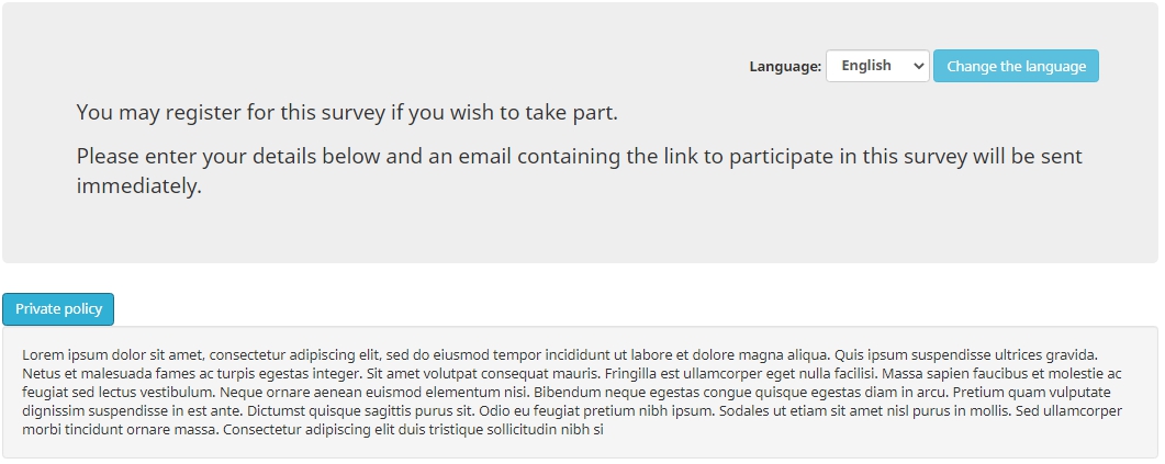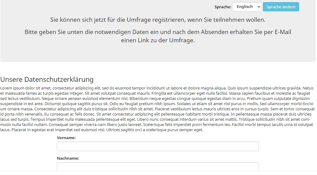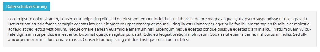 <div class="row lang-en"> <a class="btn btn-info" role="button" data-toggle="collapse" href="#collapseExample" aria-expanded="false" aria-controls="collapseExample"> Datenschutzerklärung </a> <div class="collapse" id="collapseExample"> <div class="well"> Lorem ipsum dolor sit amet, consectetur adipiscing elit, sed do eiusmod tempor incididunt ut labore et dolore magna aliqua. Quis ipsum suspendisse ultrices gravida. Netus et malesuada fames ac turpis egestas integer. Sit amet volutpat consequat mauris. Fringilla est ullamcorper eget nulla facilisi. Massa sapien faucibus et molestie ac feugiat sed lectus vestibulum. Neque ornare aenean euismod elementum nisi. Bibendum neque egestas congue quisque egestas diam in arcu. Pretium quam vulputate dignissim suspendisse in est ante. Dictumst quisque sagittis purus sit. Odio eu feugiat pretium nibh ipsum. Sodales ut etiam sit amet nisl purus in mollis. Sed ullamcorper morbi tincidunt ornare massa. Consectetur adipiscing elit duis tristique sollicitudin nibh si </div> </div> </div>