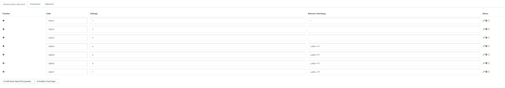 wo er seinen - vergeblichen - Versuch schildert, als Relevanzgleichung für die Gruppe "lang=='fr'" zu benutzen.I have a survey with 5 different languages.
