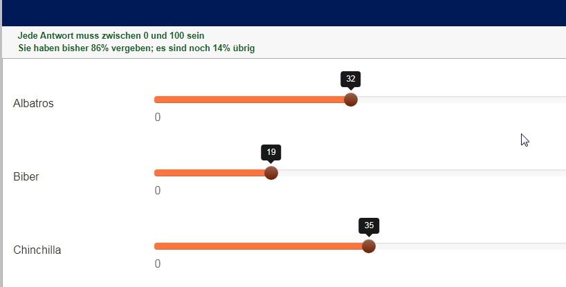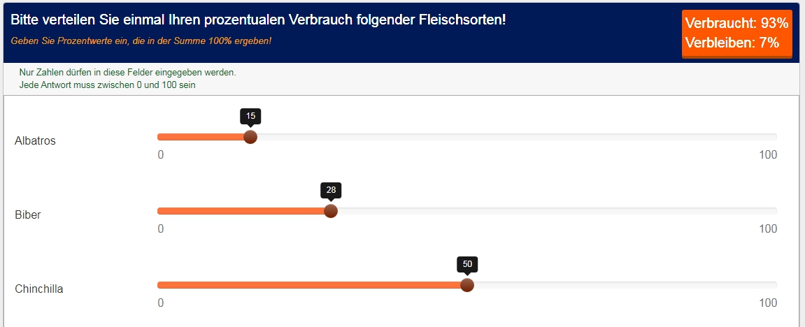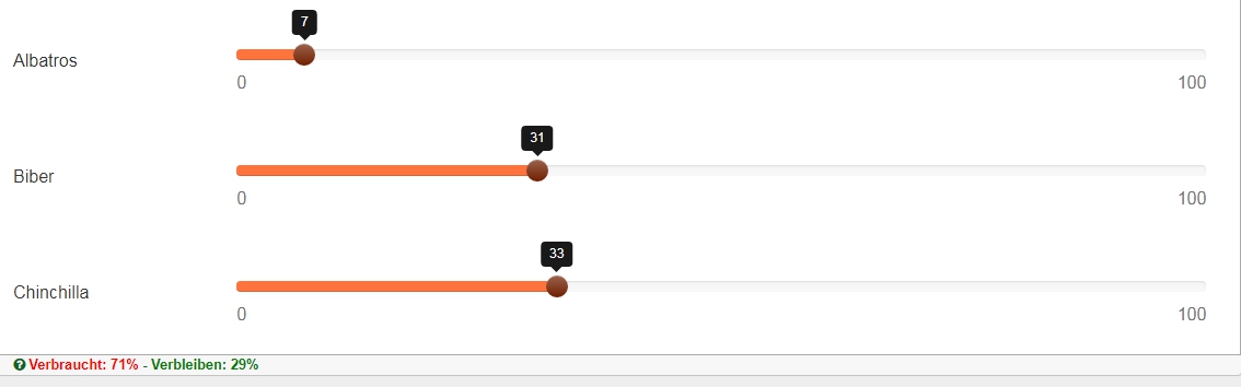 Nun zu meiner Frage: Ich nutze die Schieberegler Version. Es werden Prozentwerte eingegeben, also Maximalwert 100. Es wird alles so dargestellt wie gewollt, wenn der Wert 100 nicht erreicht wird, ist die frage rot umrahmt.
