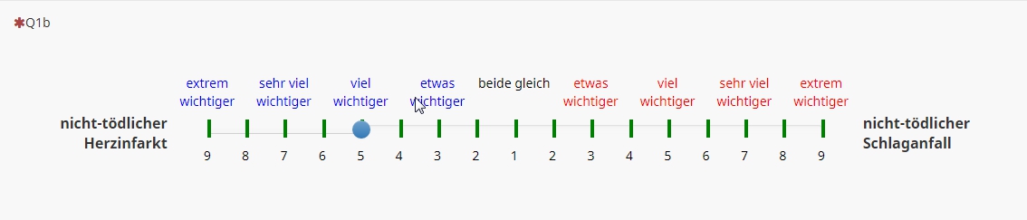 <script type="text/javascript" charset="utf-8"> $(document).on('ready pjax:scriptcomplete',function(){ var ticksArray = [ [1, '-7'], [2, '-6'], [3, '-5'], [4, '-4'], [5, '-3'], [6, '-2'], [7, '-1'], [8, '0'], [9, '1'], [10, '2'], [11, '3'], [12, '4'], [13, '5'], [14, '6'], [15, '7'], ]; var ticksArray2 = [ [1, '<img src="/lime3/upload/surveys/769143/images/smiley_red_401.png">'], [2, ''], [3, ''], [4, ''], [5, ''], [6, ''], [7, ''], [8, '<img src="/lime3/upload/surveys/769143/images/smiley_yellow_401.png">'], [9, ''], [10, ''], [11, ''], [12, ''], [13, ''], [14, ''], [15, '<img src="/lime3/upload/surveys/769143/images/smiley_green_401.png">'], ]; insertSliderTicks('{QID}', ticksArray); insertSliderTicks2('{QID}', ticksArray2); }); /* Insert Slider Tick Marks */ function insertSliderTicks(qID, ticksArray) { var thisQuestion = $('#question'+qID); $(thisQuestion).addClass('with-inserted-ticks'); $('input:text', thisQuestion).on('slideEnabled',function(){ var thisSlider = $(this); var thisItem = $(thisSlider).closest('li'); var thisMin = $('.slider-handle:eq(0)', thisItem).attr('aria-valuemin'); var thisMax = $('.slider-handle:eq(0)', thisItem).attr('aria-valuemax'); var thisRange = thisMax - thisMin; $.each(ticksArray, function(i, val) { var tickRelativePosition = val[0] - thisMin; var tickPercent = (tickRelativePosition/thisRange)*100; // Insert tick marks $('.slider-handle:eq(0)', thisItem).before('<div class="inserted-tick left-'+tickPercent+'" style="left: '+tickPercent+'%">\ <div class="tick-text">'+val[1]+'</div>\ </div>'); }); }); } /* Insert Slider Tick Marks */ function insertSliderTicks2(qID, ticksArray2) { var thisQuestion = $('#question'+qID); $(thisQuestion).addClass('with-inserted-ticks'); $('input:text', thisQuestion).on('slideEnabled',function(){ var thisSlider = $(this); var thisItem = $(thisSlider).closest('li'); var thisMin = $('.slider-handle:eq(0)', thisItem).attr('aria-valuemin'); var thisMax = $('.slider-handle:eq(0)', thisItem).attr('aria-valuemax'); var thisRange = thisMax - thisMin; $.each(ticksArray2, function(i, val) { var tickRelativePosition = val[0] - thisMin; var tickPercent = (tickRelativePosition/thisRange)*100; // Insert tick marks $('.slider-handle:eq(0)', thisItem).before('<div class="inserted-tick2 left-'+tickPercent+'" style="left: '+tickPercent+'%">\ <div class="tick-text">'+val[1]+'</div>\ </div>'); }); }); } </script>