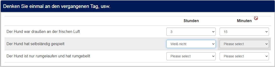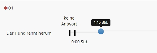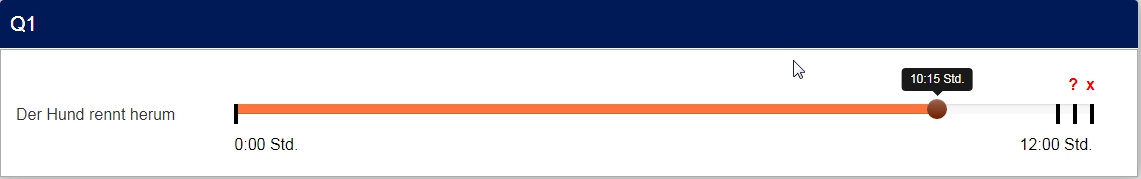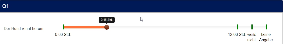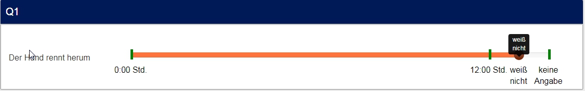 <script type="text/javascript" charset="utf-8"> $(document).on('ready pjax:scriptcomplete',function(){ // Identify this question var thisQuestion = $('#question{QID}'); // Define the text strings var tipTexts = { 0: '0:00 Std.', 1: '0:15 Std.', 2: '0:30 Std.', 3: '0:45 Std.', 4: '1:00 Std.', 5: '1:15 Std.', 6: '1:30 Std.', 7: '1:45 Std.', 8: '2:00 Std.', 9: '2:15 Std.', 10: '2:30 Std.', 11: '2:45 Std.', 12: '3:00 Std.', 13: '3:15 Std.', 14: '3:30 Std.', 15: '3:45 Std.', 16: '4:00 Std.', 17: '4:15 Std.', 18: '4:30 Std.', 19: '4:45 Std.', 20: '5:00 Std.', 21: '5:15 Std.', 22: '5:30 Std.', 23: '5:45 Std.', 24: '6:00 Std.', 25: '6:15 Std.', 26: '6:30 Std.', 27: '6:45 Std.', 28: '7:00 Std.', 29: '7:15 Std.', 30: '7:30 Std.', 31: '7:45 Std.', 32: '8:00 Std.', 33: '8:15 Std.', 34: '8:30 Std.', 35: '8:45 Std.', 36: '9:00 Std.', 37: '9:15 Std.', 38: '9:30 Std.', 39: '9:45 Std.', 40: '10:00 Std.', 41: '10:15 Std.', 42: '10:30 Std.', 43: '10:45 Std.', 44: '11:00 Std.', 45: '11:15 Std.', 46: '11:30 Std.', 47: '11:45 Std.', 48: '12:00 Std.', 49: 'weiß nicht', 50: 'keine Angabe' }; $('input:text', thisQuestion).on('slideEnabled',function(){ var thisItem = $(this).closest('li'); // Insert custom tooltip $('.tooltip-inner', thisItem).addClass('tooltip-inner-1 hidden'); var i0=$(this).val(); i0=Number(i0); $('.tooltip', thisItem).append('<div class="tooltip-inner tooltip-inner-2">'+tipTexts[i0]+'</div>'); // Listener on slider $(this).on('slide slideStop', function(event) { // Handle dynamic tooltip text var i1=$(this).val(); i1=Number(i1); $('.tooltip-inner-2', thisItem).html(tipTexts[i1]); }); }); }); </script> <script type="text/javascript" charset="utf-8"> $(document).on('ready pjax:scriptcomplete',function(){ var ticksArray = [ [0, '0:00 Std.'], [48, '12:00 Std.'], [49, ''], [50, ''], ]; var ticksArray2 = [ [49, '<span style="color:red;font-size:12pt;font-weight:bold">?</span>'], [50, '<span style="color:red;font-size:12pt;font-weight:bold">x</span>'] ]; insertSliderTicks('{QID}', ticksArray); insertSliderTicks2('{QID}', ticksArray2); }); /* Insert Slider Tick Marks */ function insertSliderTicks(qID, ticksArray) { var thisQuestion = $('#question'+qID); $(thisQuestion).addClass('with-inserted-ticks'); $('input:text', thisQuestion).on('slideEnabled',function(){ var thisSlider = $(this); var thisItem = $(thisSlider).closest('li'); var thisMin = $('.slider-handle:eq(0)', thisItem).attr('aria-valuemin'); var thisMax = $('.slider-handle:eq(0)', thisItem).attr('aria-valuemax'); var thisRange = thisMax - thisMin; $.each(ticksArray, function(i, val) { var tickRelativePosition = val[0] - thisMin; var tickPercent = (tickRelativePosition/thisRange)*100; // Insert tick marks $('.slider-handle:eq(0)', thisItem).before('<div class="inserted-tick left-'+tickPercent+'" style="left: '+tickPercent+'%">\ <div class="tick-text">'+val[1]+'</div>\ </div>'); }); }); } /* Insert Slider Tick Marks */ function insertSliderTicks2(qID, ticksArray2) { var thisQuestion = $('#question'+qID); $(thisQuestion).addClass('with-inserted-ticks'); $('input:text', thisQuestion).on('slideEnabled',function(){ var thisSlider = $(this); var thisItem = $(thisSlider).closest('li'); var thisMin = $('.slider-handle:eq(0)', thisItem).attr('aria-valuemin'); var thisMax = $('.slider-handle:eq(0)', thisItem).attr('aria-valuemax'); var thisRange = thisMax - thisMin; $.each(ticksArray2, function(i, val) { var tickRelativePosition = val[0] - thisMin; var tickPercent = (tickRelativePosition/thisRange)*100; // Insert tick marks $('.slider-handle:eq(0)', thisItem).before('<div class="inserted-tick2 left-'+tickPercent+'" style="left: '+tickPercent+'%">\ <div class="tick-text">'+val[1]+'</div>\ </div>'); }); }); } </script>