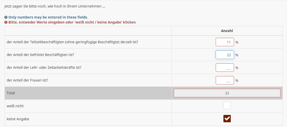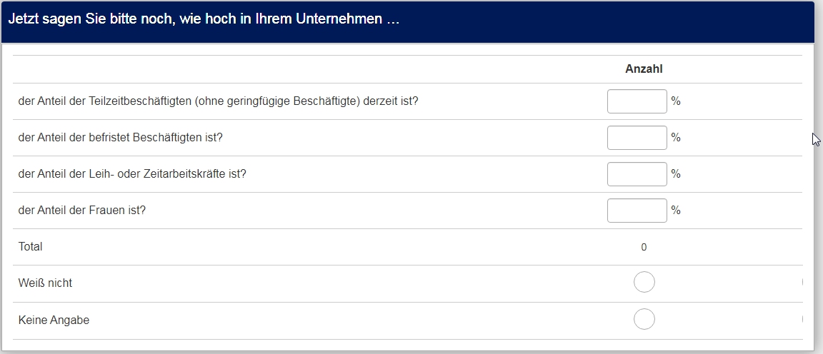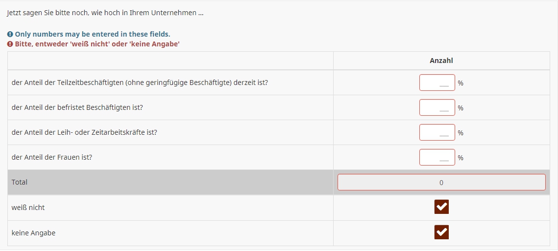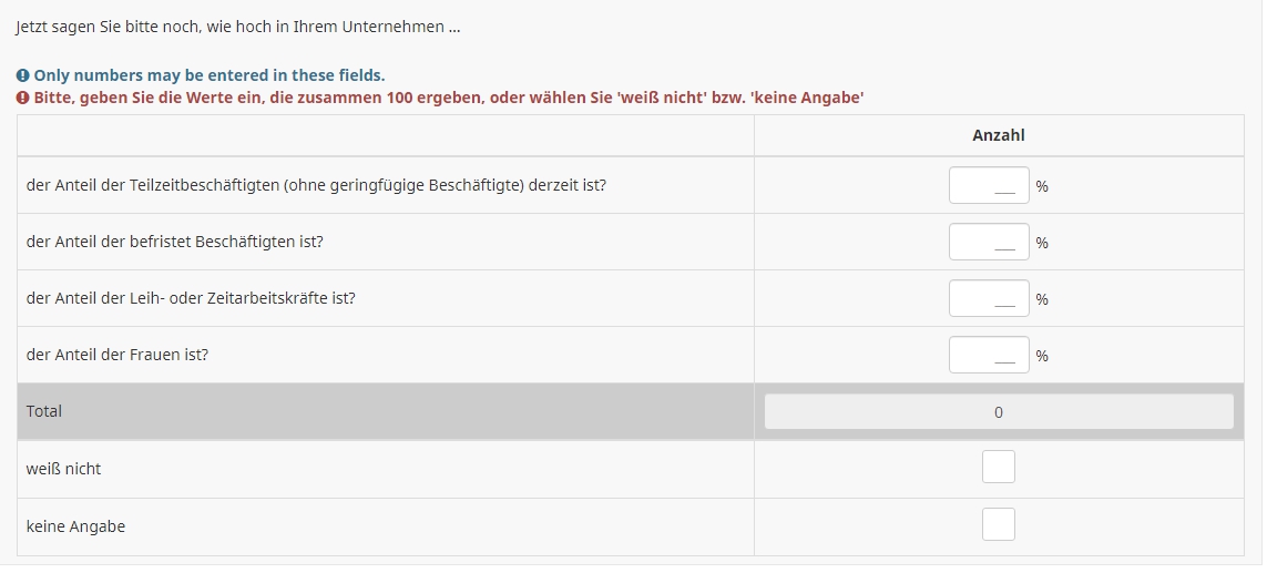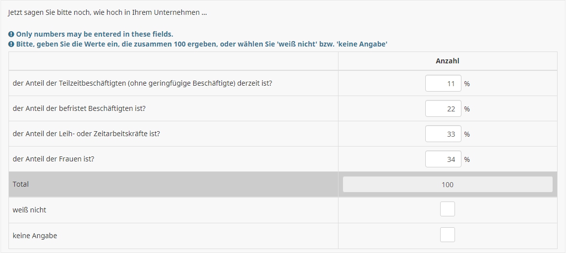 <script type="text/javascript" charset="utf-8"> $(document).on('ready pjax:scriptcomplete',function(){ // Identify this question var thisQuestion = $('#question{QID}'); var lastInput = $('input:text:last', thisQuestion); var lastItem = $(lastInput).closest('div'); // Insert the check-box $(lastItem).addClass('checkbox-item with-inserted-checkbox').append('<input type="checkbox" name="insertedInput" id="insertedInput" value=""><label for="insertedInput" class="checkbox-label control-label"></label>'); // Listener on the checkbox $(':checkbox', lastItem).on('change', function(e) { if($(this).is(':checked')) { $('input:text', thisQuestion).not(lastInput).val('').trigger('keyup'); $(lastInput).val(100).trigger('keyup'); $('li.ls-group-dynamic', thisQuestion).hide(); } else { $('li.ls-group-dynamic', thisQuestion).show(); $(lastInput).val('').trigger('keyup'); } }); }); </script> <style type="text/css">.numeric-multi .with-inserted-checkbox input.form-control { position: absolute; left: -9999em; } .numeric-multi .with-inserted-checkbox label::before, .numeric-multi .with-inserted-checkbox label::after { margin: -7px 0 0 0; } </style>