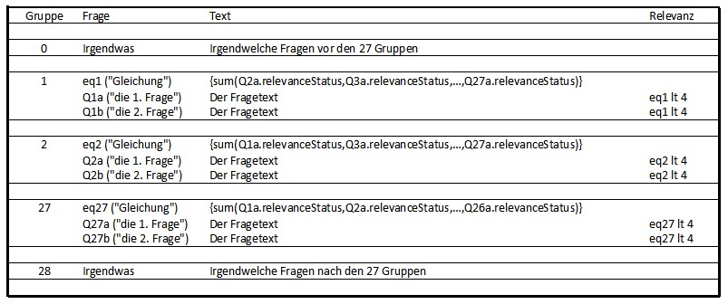 In jeder dieser Gleichungen wird der "relevanceStatus" aller ANDEREN 26 ersten Fragen summiert.