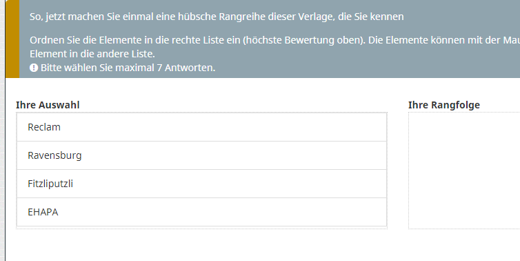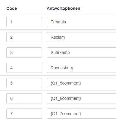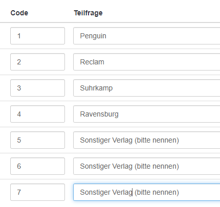 Dazu müssen die Codes in beiden Fragen identisch sein, also nicht das in der Rangreihe vorgeschlagene "A1", "A2"; am besten einfach numerisch "1", "2",...