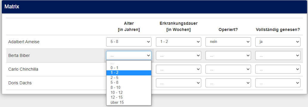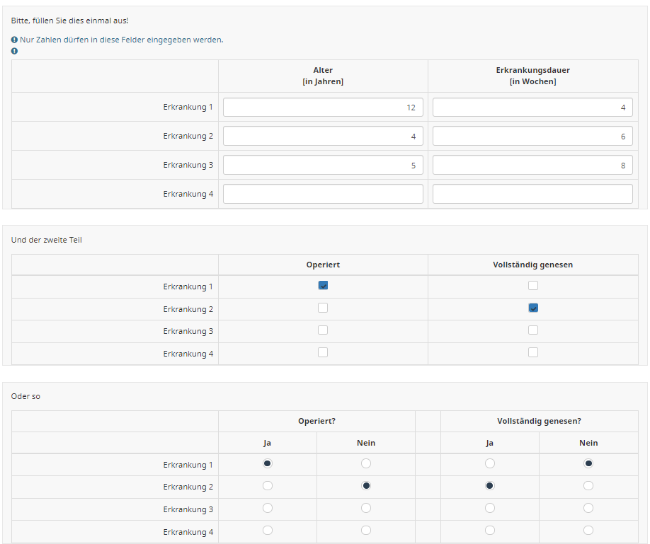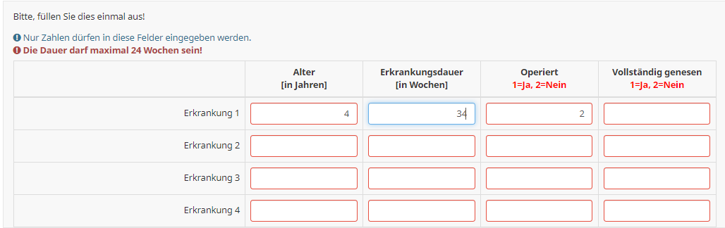 Gibt es nicht, es geht um eine Erhebung, welche Krankheiten überhaupt auftreten bei welchen Linien und welcher Eignung am Ende dann. Ob die Tiere in ihrer Arbeit eingeschränkt sind oder nicht etc. und ob die Erkrankung zum Tode geführt hat, ob sich lokale Häufungen finden, sowas alles... Ich kann es also nicht von vorne herein einschränken, höchstens dann als Bedingung abfragen, also wenn z.b. jemand BS-Vorfall mit JA ankreuzt dann weitere Fragen dazu. Mal gucken, ob das nicht den Rahmen sprengt, es ist ja "nur" eine Projektarbeit im Moment, das sollte also keine 400 seitige Auswertung werden am Schluss.2. Könntest Du die Frage aufteilen. Der Teilnehmer hat dadurch keinen Klick mehr, eher weniger, da er nicht zweimal klicken muss (um das Drop-Down zu öffnen und dann den Wert auszuwählen)