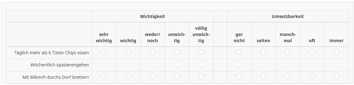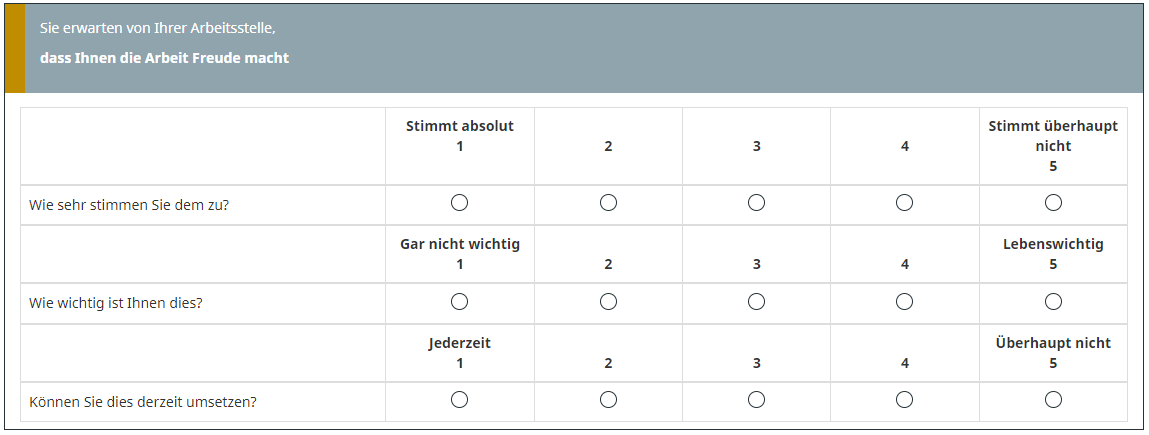 Mein Fragebogen enthält zu jeder Hauptfrage (5-stufige Antwortskala) immer zwei Teilfragen, die jeweils andere Antworten zulassen (Teilfrage 1: Wie wichtig ist Ihnen das? - "sehr wichtig" bis "unwichtig" 5 Stufen, Teilfrage 2: Können Sie das derzeit umsetzen - "gar nicht" bis "immer" 5 Stufen).