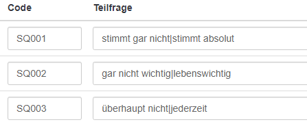 Unter www.limesurvey.org/manual/Adding_answers_or_subquestions/de scheint eine Möglichkeit beschrieben zu sein wie man das machen kann ("|" zwischen die Antworten setzen), das funktioniert in meiner Version aber offenbar nicht. Dort werden dann beide Antworten als eine Antwort mit einem "|" abgebildet. Ich brauche eine Funktion, bei der ich Antwortoptionen zu den jeweiligen Teilfragen bearbeiten kann.