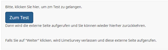 Sollen die Teilnehmer (innen, außen, oben, unten, das musste einfach sein)  nach dem Test irgendwie in LimeSurvey weitermachen oder ist dann Schluss (dass LimeSurvey also nur für die Bereitstellung des Links zuständig ist)?