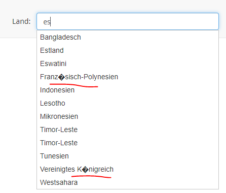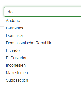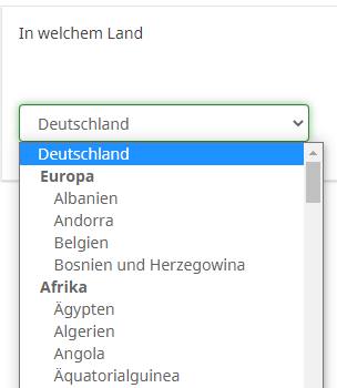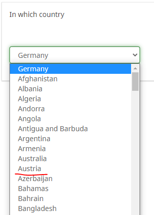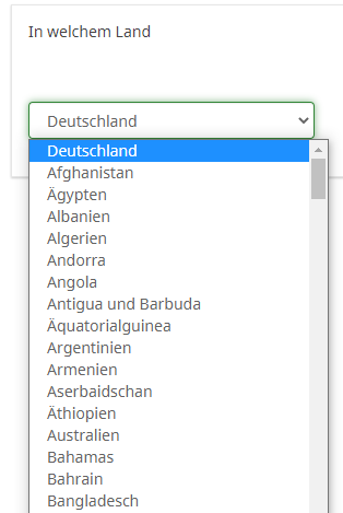 2. Meiner Ansicht nach das Beste bei solchen Fragen, ist ein "autocomplete".Wobei ich auch noch frage: Glaubst Du, es werden Teilnehmer aus Kiribati, dem Südsudan oder Guayana in erwähnenswerter Anzahl antworten?