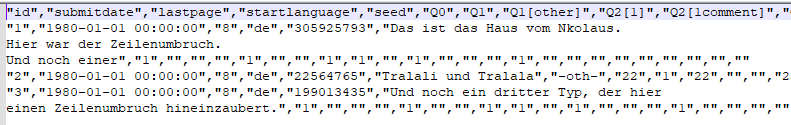 offenbar bereitet der Datenexport Probleme, wenn Freitextfelder vorhanden sind, bei denen die Respondenten Zeilenumbrüche eingebaut haben. In unserer Umfrage verwenden wir Freitextfelder mit dem Fragentyp „Langer freier Text (Type: T)“ ohne eine Begrenzung der maximalen Zeichenzahl.