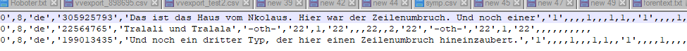 Tja, die komischen Zeilenumbrüche in der CSV-Datei entstehen offenbar durch Zeilenumbrüche bei der Eingabe im freien Textfeld. Bei mir sieht es aus wir bei Joffm unter 1.