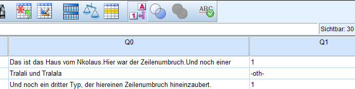 Hatte einen ähnlichen Fall schon mal in einem anderen, proprietären Marktforschungstool. Die Datei lässt sich zwar per Hand relative leicht bereinigen, aber je nach dem wie häufig sowas vorkommt und wie gross die Datei ist, dann das schon ziemlich dauern.
