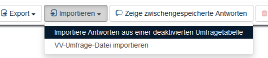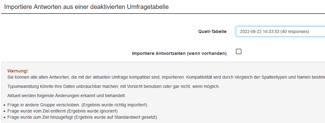 Da Du ja gesehen hast, dass hier aus Drop-Downs ausgewählt wird, kannst Du nicht in Umfrage 123456 Daten einer Umfrage 654321 importieren.