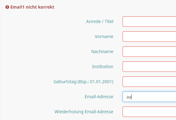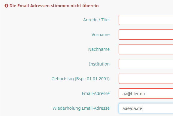 Was gilt bei der E-Mail-Adresse? Entweder ist eine noch leer oder beide sind nicht leer und stimmen überein.