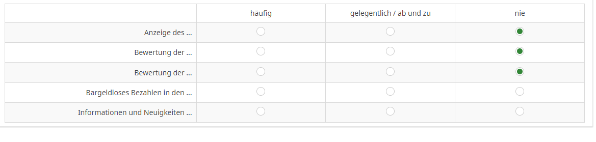 Wie wäre es denn, dieses letzte (Gesamt)-Item nur dann anzuzeigen, wenn wenigstens eins der Teil-Items nicht mit "Nie" beantwortet wurde?