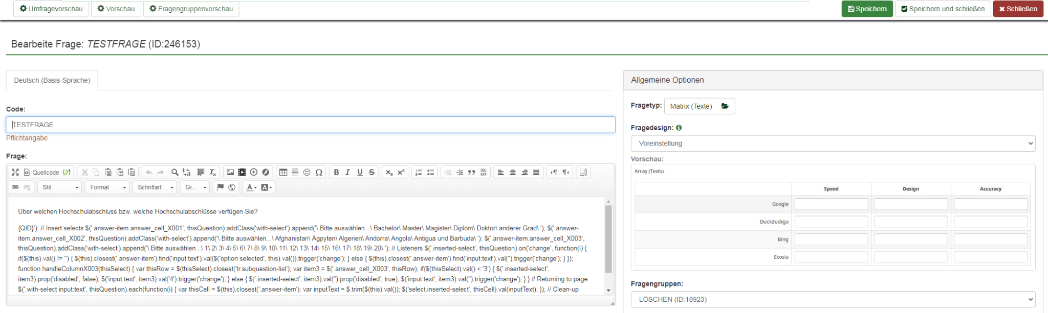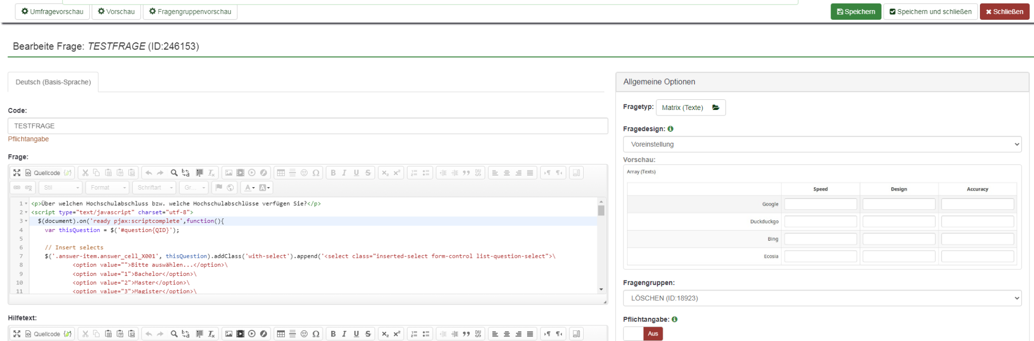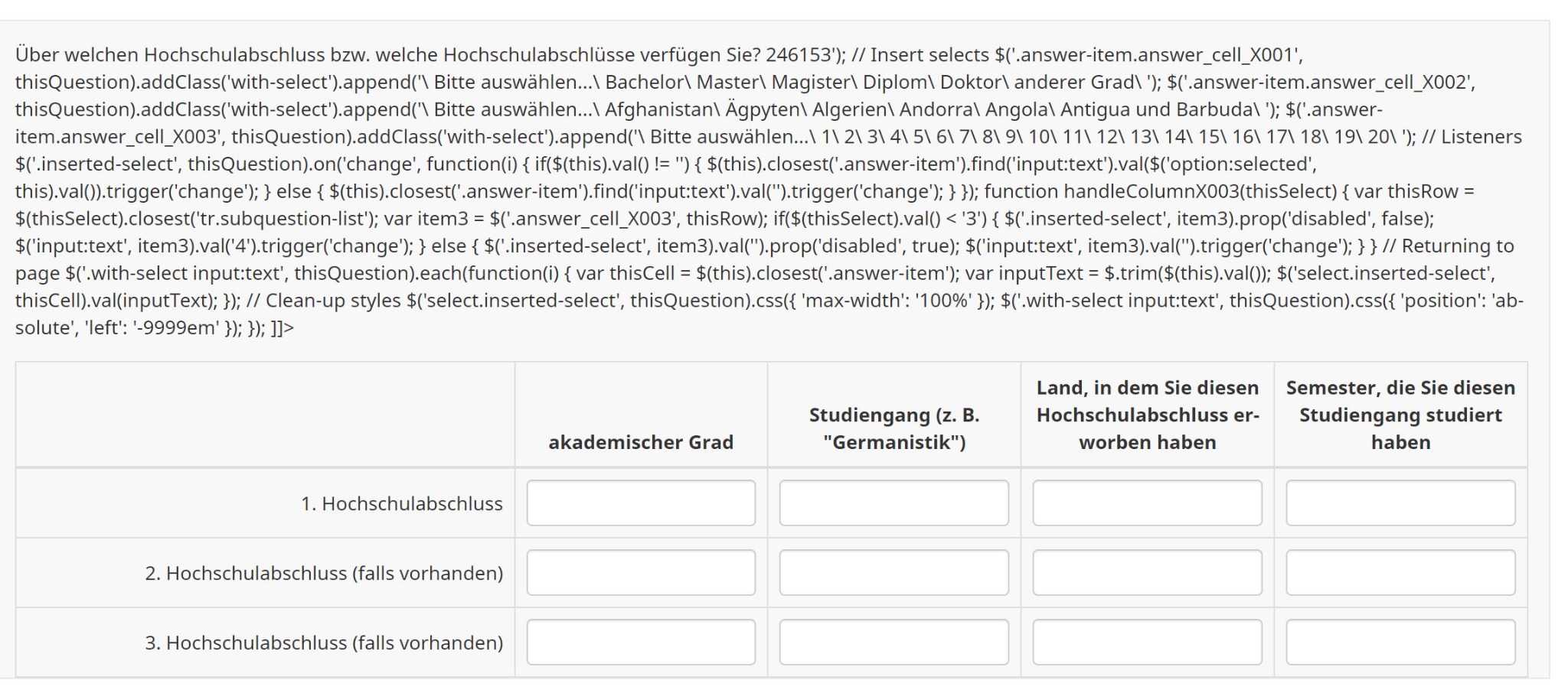 Der Fehler liegt bei LimeSurvey. Kein Tool hat den XSS-Schutz so implementiert wie LimeSurvey. Kein Befragungstool ist so auf Workarounds angewiesen. Kein Tool verhindert konsequenter den Einsatz von Workarounds. Die Verlagerung der XSS-Filter auf Userebene ist notwendig.Und die Aussage des Admins "Die Verwendung vom Javascript sollte aber trotzdem prinzipiell möglich sein." ist ein bisschen witzig.