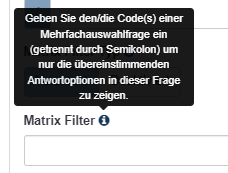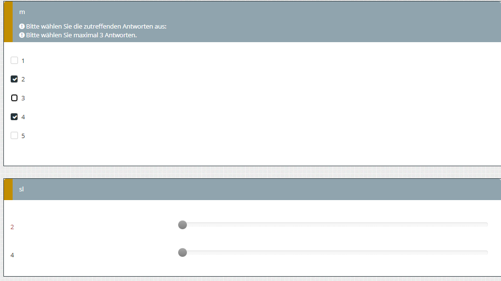 In Bild 1 ist zu sehen, was ich erreichen möchte: Die Umfrageteilnehmenden sollen aus der Auswahl von 8 Möglichkeiten (hier Speisen) sich für MAXIMAL 3 (habe ich unter "Logik", maximale Antworten = 3) eingestellt) entscheiden und deren Ausprägungsgrad mittels des Schiebereglers angeben. Die Frage sieht vor, dass Sie MINDESTENS eine der Speisen auswählen MÜSSEN (also sie sollen die Frage nicht unbeantwortet lassen, dh. nicht auf "Weiter" klicken dürfen, bevor sie nicht mind. eine der Speisen mit dem Schieberegler eingestellt haben. (Den Ausprägungsgrad (1-100) sollen sie auch nicht sehen, das funktioniert bereits mit einem hier im Forum geteilten javascript.)