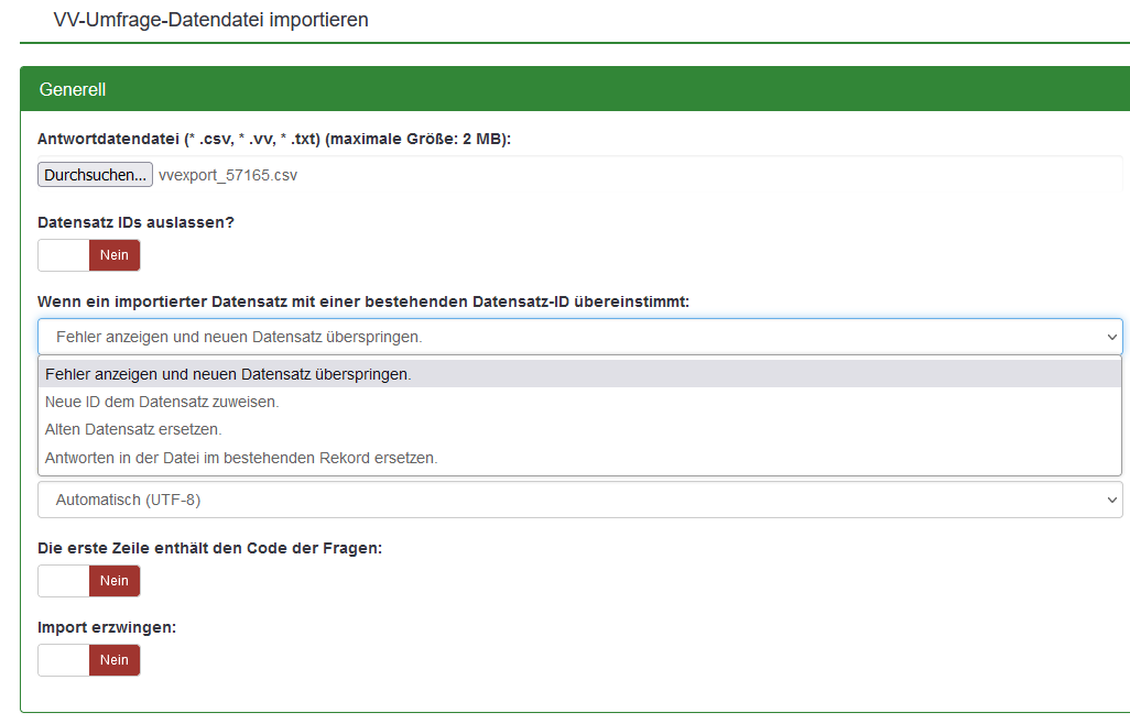 Standardmäßig werden die bestehenden Antworten ausgelassen (Datensatz IDs auslassen auf Ja eingestellt) und nicht doppelt importiert.