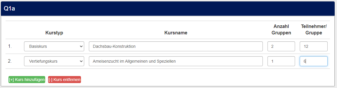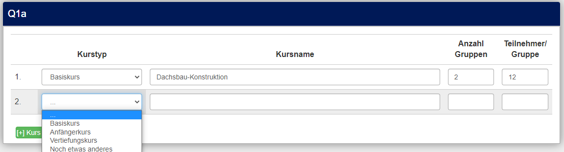 -Antwortmöglichkeit: Kurs: XY___________ Anzahl an Gruppen:_________ Teilnehmer pro Gruppe:_______