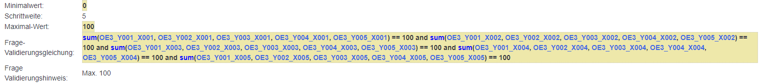 Der Nachteil einer/jeder solchen Validierung ist natürlich, dass die Frage sofort mit einem Fehler startet, da ja keine Summe =100 ist.