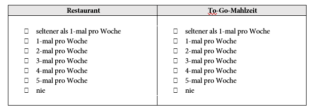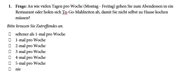 In der Frage davor geht es darum, an wie vielen Tagen (Mo-Fr) der Proband sein Abendessen nicht selbst zubereitet, sondern Essen geht bzw. sich To-Go-Essen kauft: