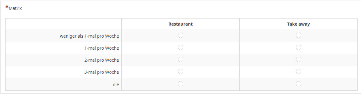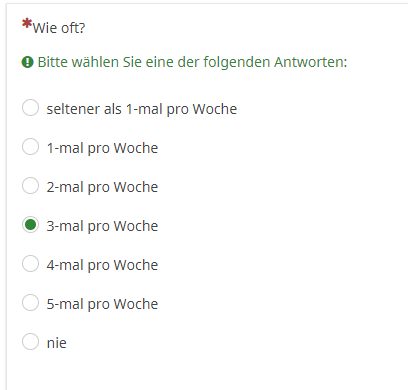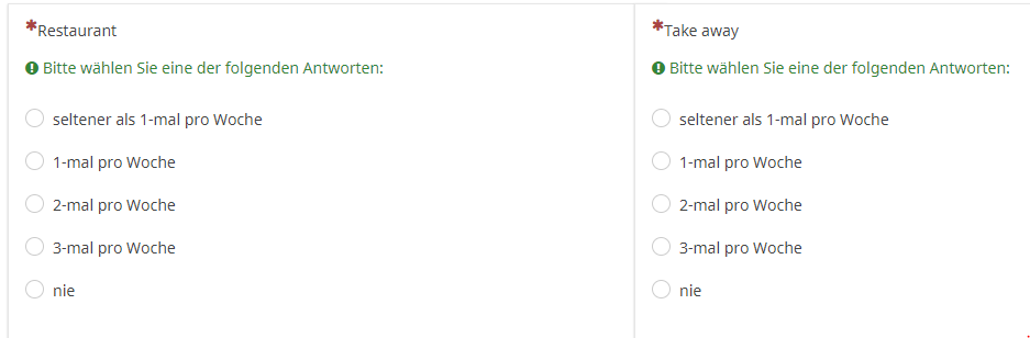 Auf Basis des dort angeklickten, z.B. "3-mal pro Woche", soll er in den nächsten beiden Fragen dann nicht die Möglichkeit haben, z.B. jeweils bei Restaurants und To-Go-Essen "5-mal pro Woche" ankreuzen zu können, sondern in Summe nur max. 3-mal pro Woche, also z.B. 1-mal pro Woche Restaurant, 2-mal pro Woche To-Go-Essen.