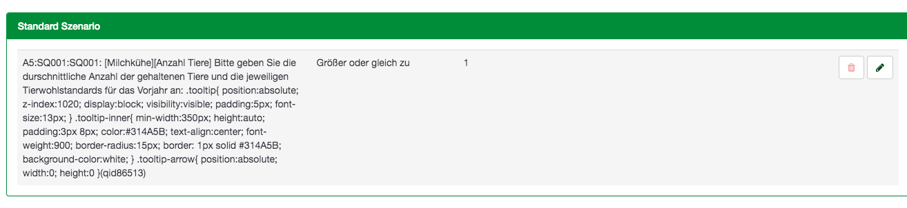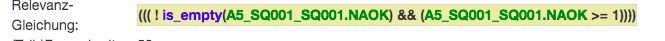 Ich wollte über das Design Format Bedingungen hinzufügen, die werden aber immer mit einem is_empty Code angezeigt. Eigentlich sollte aber Frage R4 Frage nur angezeigt werden, wenn die Frage A4 mind. bei einem feld ausgefüllt wurde (A4 ist eine Matrix Frage mit zwei Spalten und 11 Zeilen wo man die ANzahl sowie noch einen Standard einfügen kann). R4 soll also nur angezeigt werden, wenn mind. 1 Feld bei A4 angezeigt wurde.
