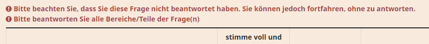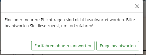Das klingt danach, als sei dies bei allen Fragen der Fall. Falls nicht, zeige bitte, bei welchem Fragentyp dies auftaucht (ich gehe jetzt davon aus, dass nicht "deutsch(Du)" als Basissprache gewählt ist)wenn sie eine Frage nicht beantwortet haben. In dem erscheinenden, automatischen Hinweistext werden sie geduzt,