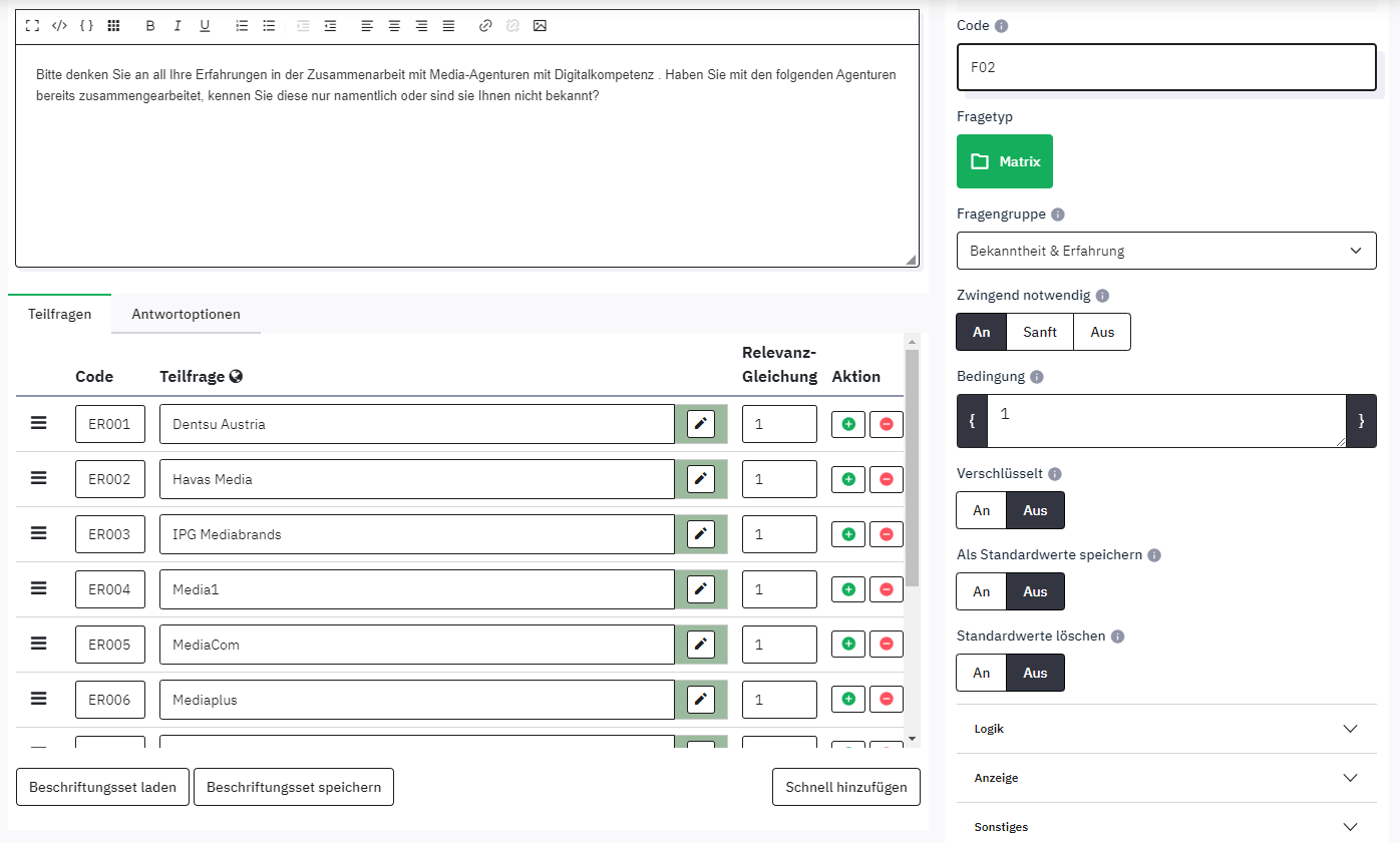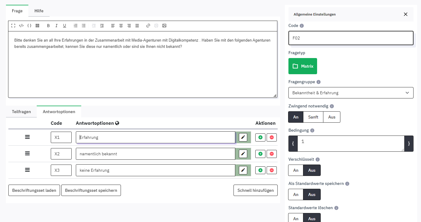 Ich habe eine Frage F02 mit insgesamt 11 Teilfragen, deren Codierung ich auch in der F03 verwende.