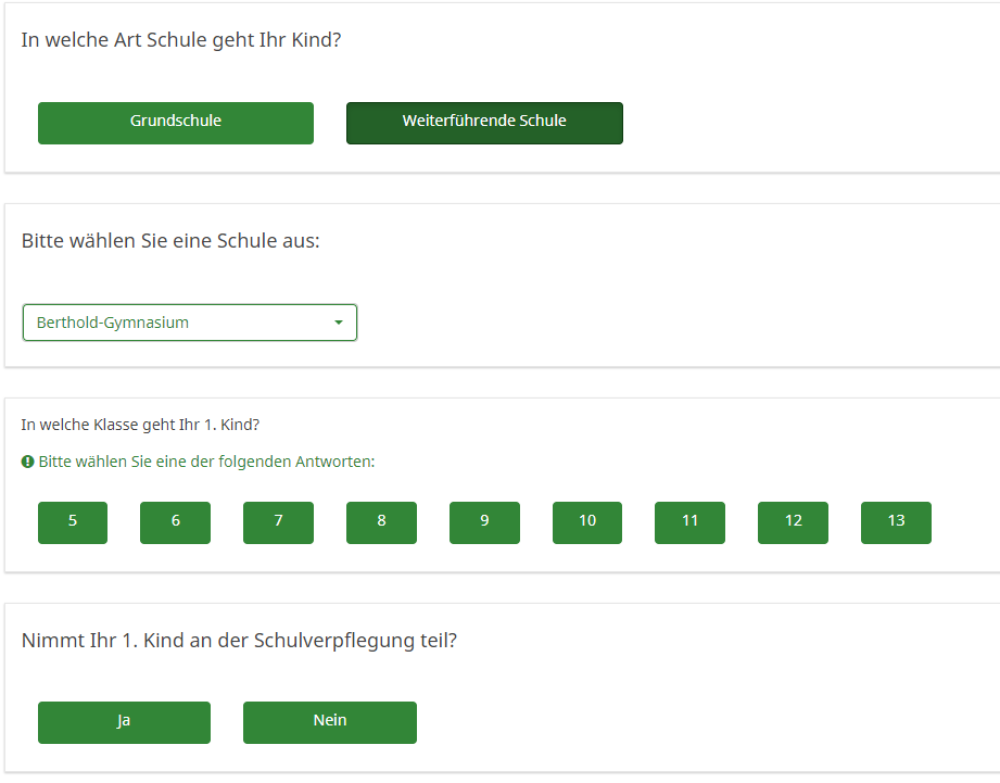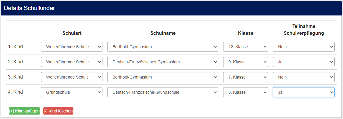Dann folgen 7 Fragegruppen, wovon nur so viele angezeigt werden, wie Schulkinder ausgewählt wurden (Fragengruppen "1. Kind" bis "7. Kind")