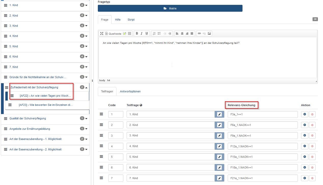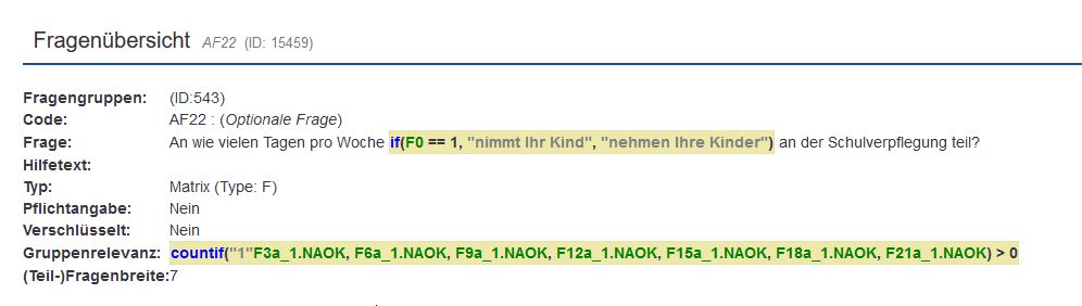 =11.0ptHallo lieber Helfer,=11.0pt =11.0ptes hat sich ein weiteres für mich bisher unlösbares Problem aufgetan bezüglich der Gruppe "Zufriedenheit mit der Schulverpflegung" mit der Bedingung=11.0ptcountif("2",F3a_,F6a_,F9a_,F12a_,F15a_,F18a_,F21a_)>0, und zwar folgendes:=11.0ptDie erste Frage der Gruppe ("An wie vielen ") hat 7 Teifragen (für Schulkind 1-7). Wenn manche Kinder gar nicht am Essen teilnehmen, sollte die entsprechende Teilfrage auch nicht auftauchen. Also es sollten nur die Teilfragen angezeigt werden für die Kinder, die auch am Essen teilnehmen.=11.0ptIch habe Relevanzgleichungen in die Teilfragen eingegeben, die auch funktionieren - aber nur OHNE die oben genannte Gruppenbedingung. Sobald ich die Gruppenbedingung wieder einfüge, werden alle Teilfragen angezeigt.=11.0ptKann da jemand helfen?=11.0ptOder soll ich dafür ein neues Thema öffnen?