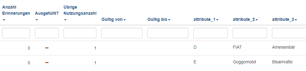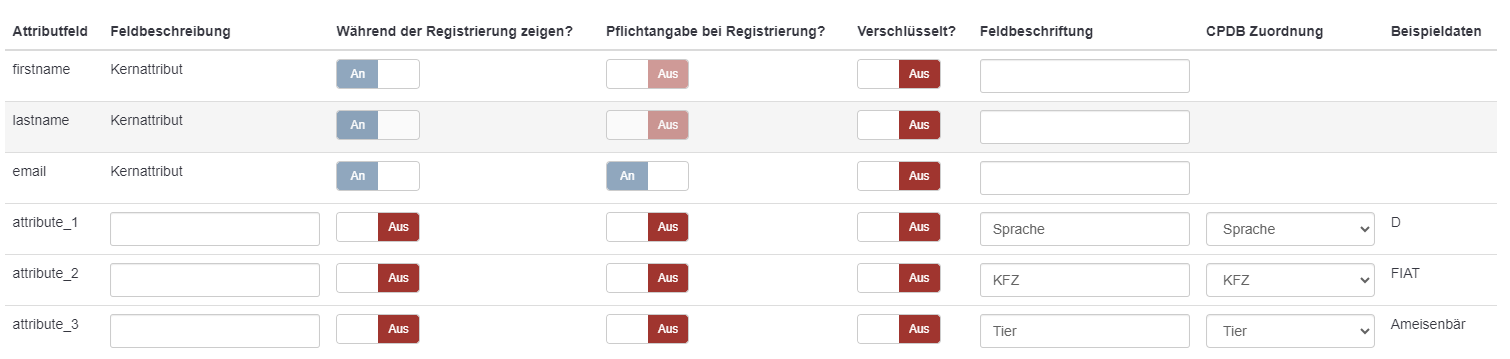 In der Teilnehmer-Tabelle 3 zusätzliche Attribute erzeugt (Sprache, KFZ, Tier) und die CPDB-Zuordnung (der Einfachheit halber gleichnamige, ist aber irrelevant) eingetragen